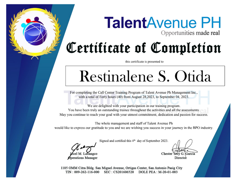 Hello, I'm Restin, a graduate in General Virtual Assistant in DICT, and I hold a degree in Office Administration. I've worked in various roles such as Email Managing, Telesales, Cashier, Barista, and Customer Service. Recently, I excelled in handling emails and managing campaigns for 4 months. I also worked as a Virtual Assistant on Upwork, where I gained proficiency in photo and video editing, MS Office, Canva, and much more. I'm adept with computers, a quick learner, and I am excited to apply my skills to your team.